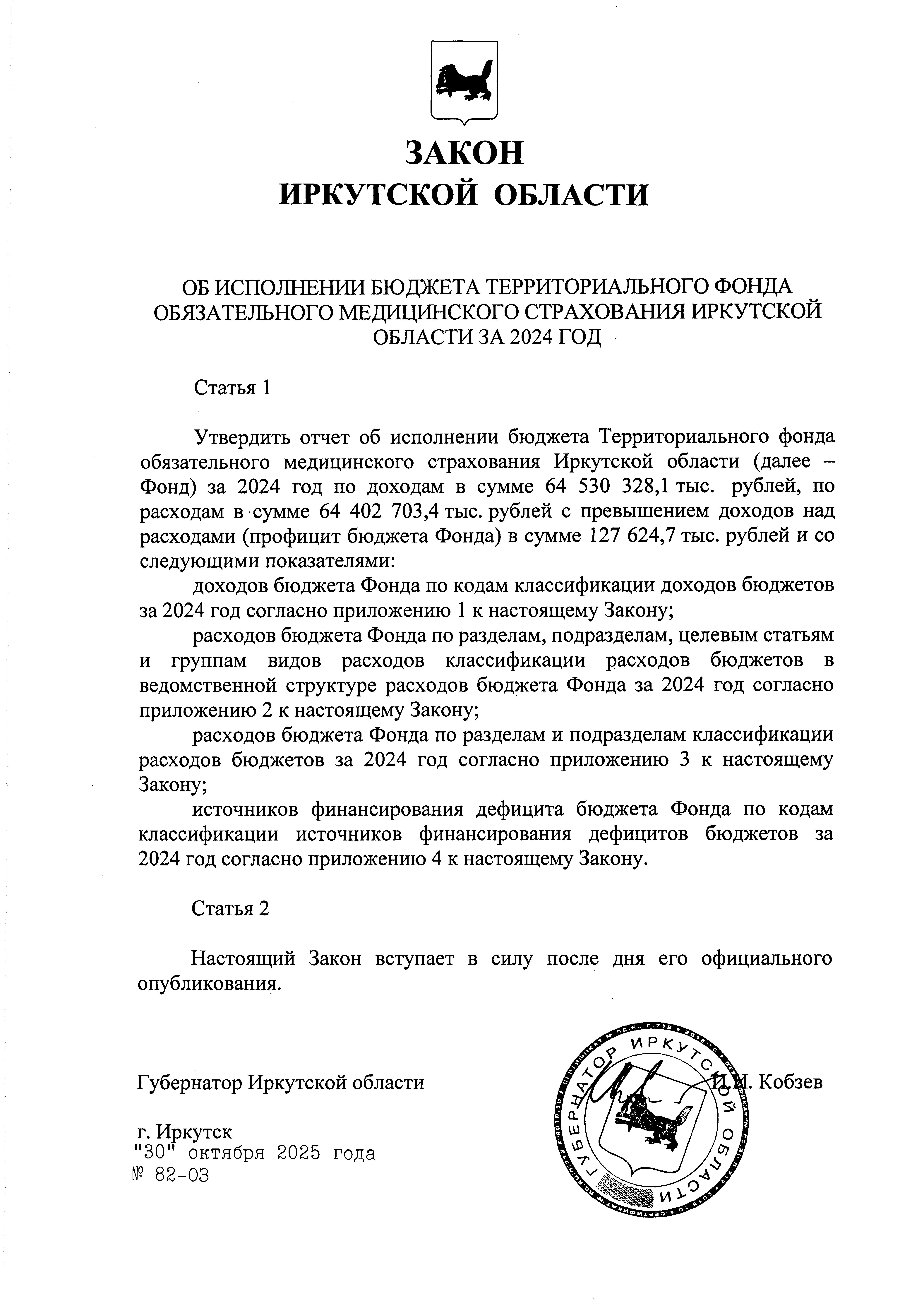 "Об исполнении бюджета Территориального фонда обязательного медицинского страхования Иркутской области за 2024 год"