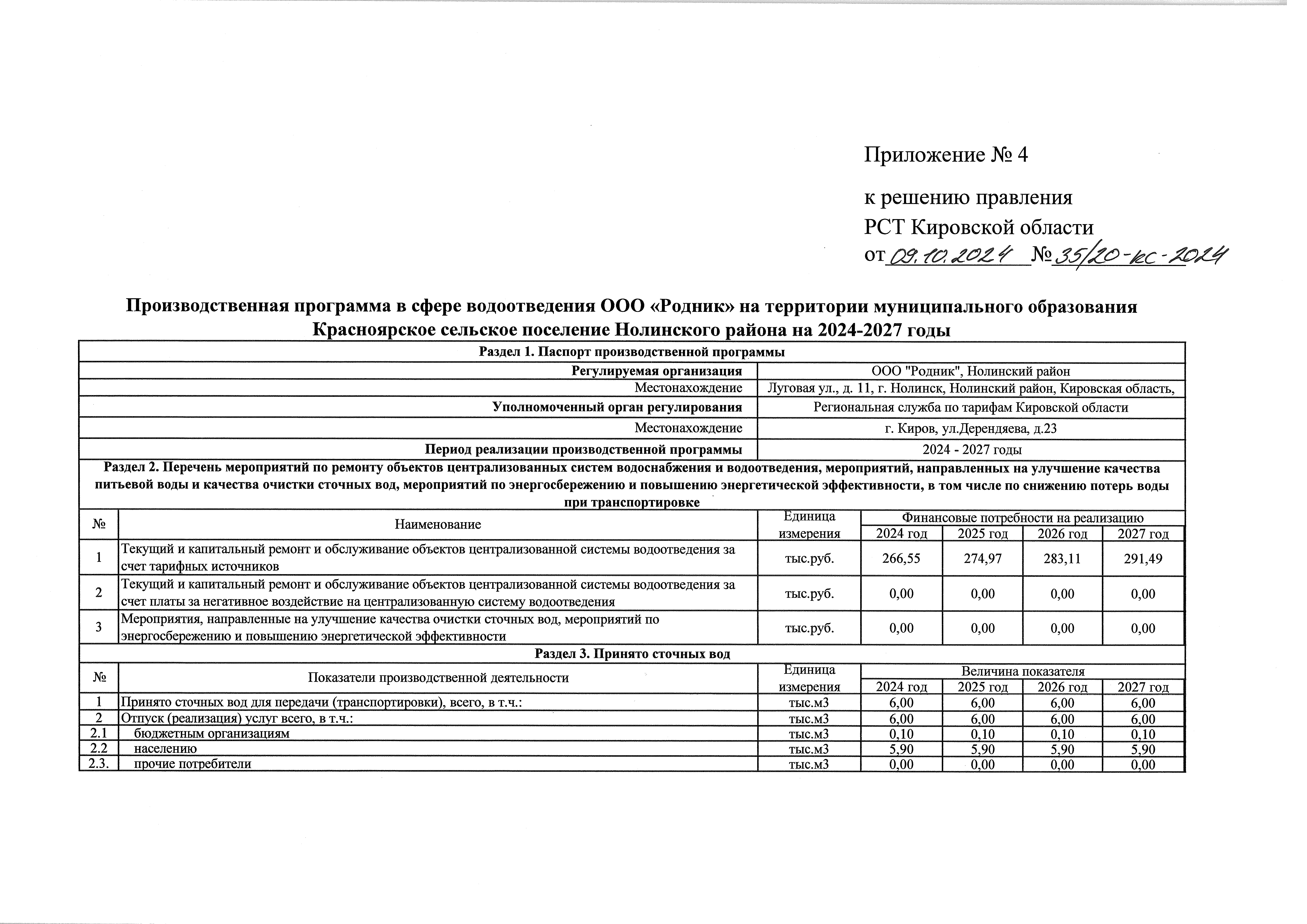 Решение правления региональной службы по тарифам Кировской области от 09.10.2024 № 35/20-кс-2024