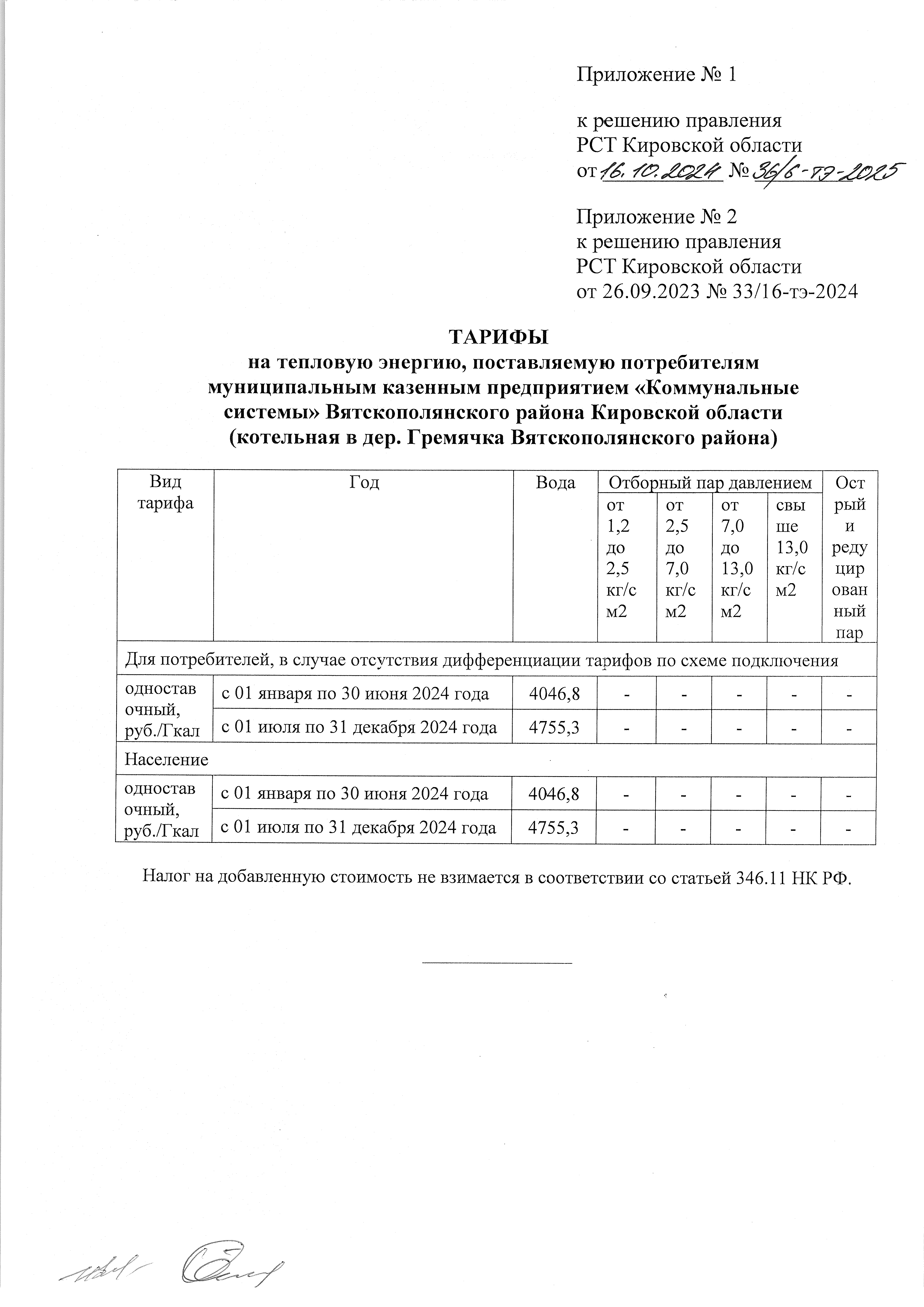 Решение правления региональной службы по тарифам Кировской области от 16.10.2024 № 36/6-тэ-2025