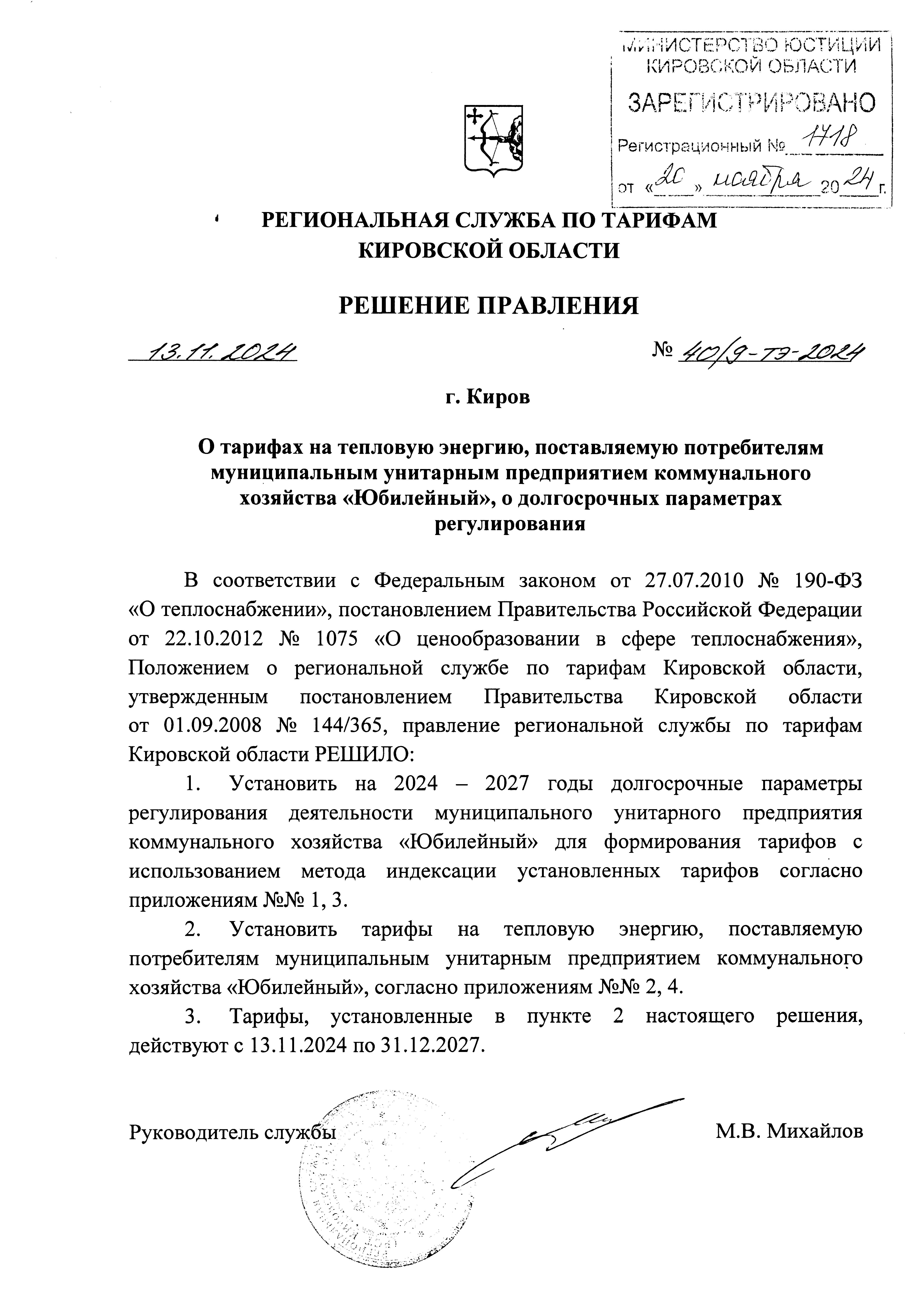 Решение правления региональной службы по тарифам Кировской области от 13.11.2024 № 40/9-тэ-2024