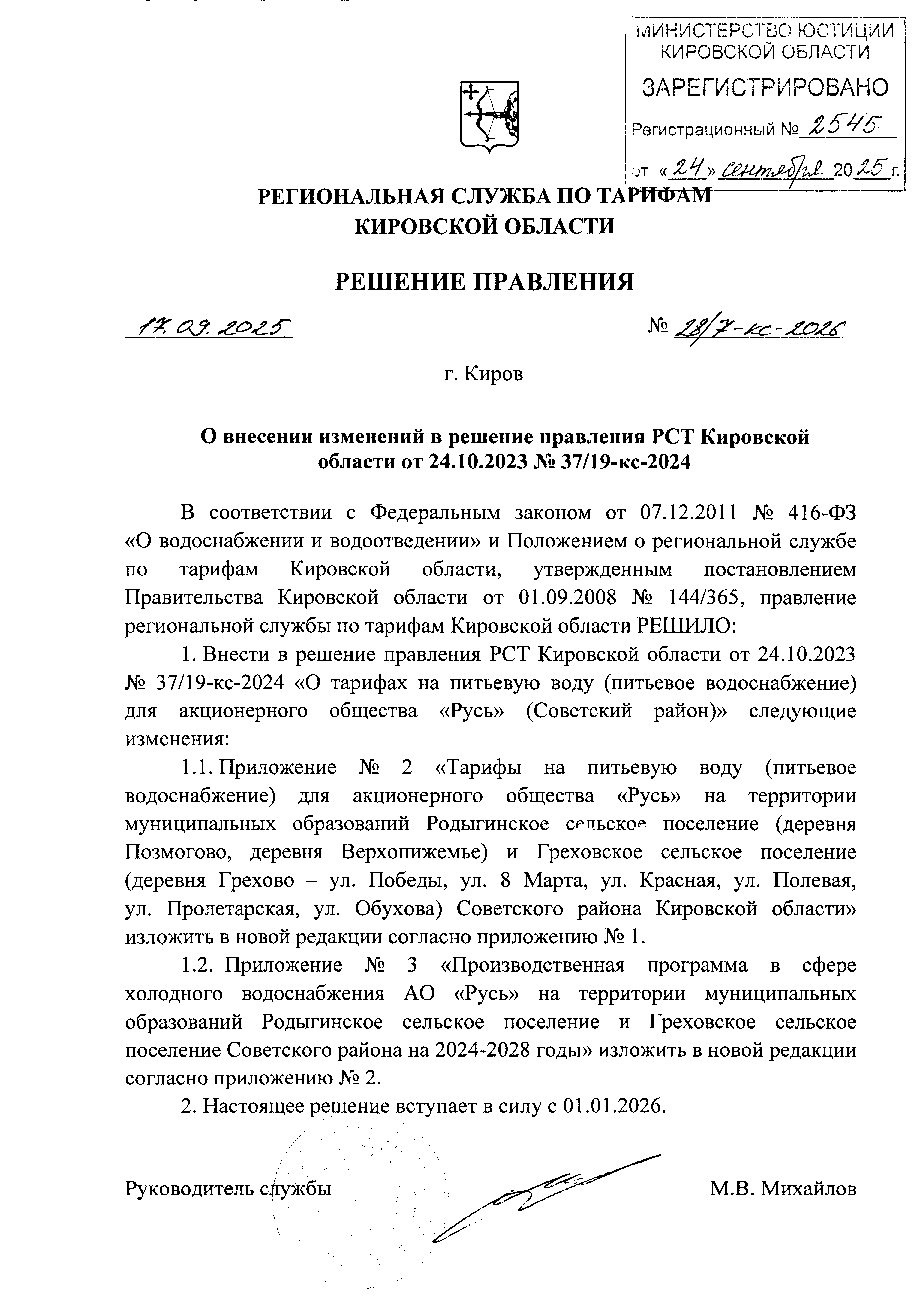 Решение правления региональной службы по тарифам Кировской области от 17.09.2025 № 28/7-кс-2026