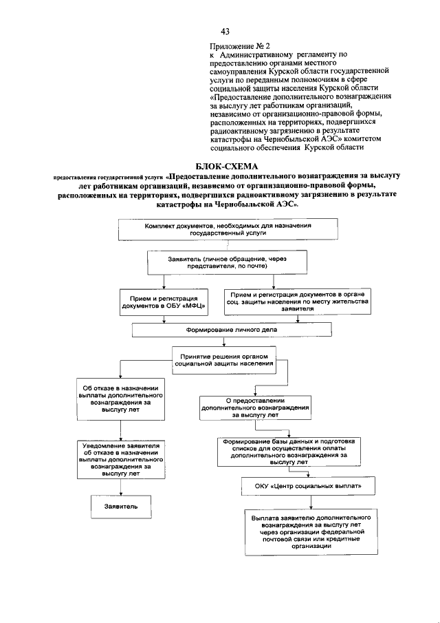 Приказ Комитета социального обеспечения Курской области от 04.10.2018 № 262 "О внесении изменений в Административный регламент по предоставлению органами местного самоуправления Курской области государственной услуги по переданным полномочиям в сфере социальной защиты населения Курской области "Предоставление дополнительного вознаграждения за выслугу лет работникам организаций, независимо от организационно-правовой формы, расположенных на территориях, подвергшихся радиоактивному загрязнению в результате катастрофы на Чернобыльской АЭС"