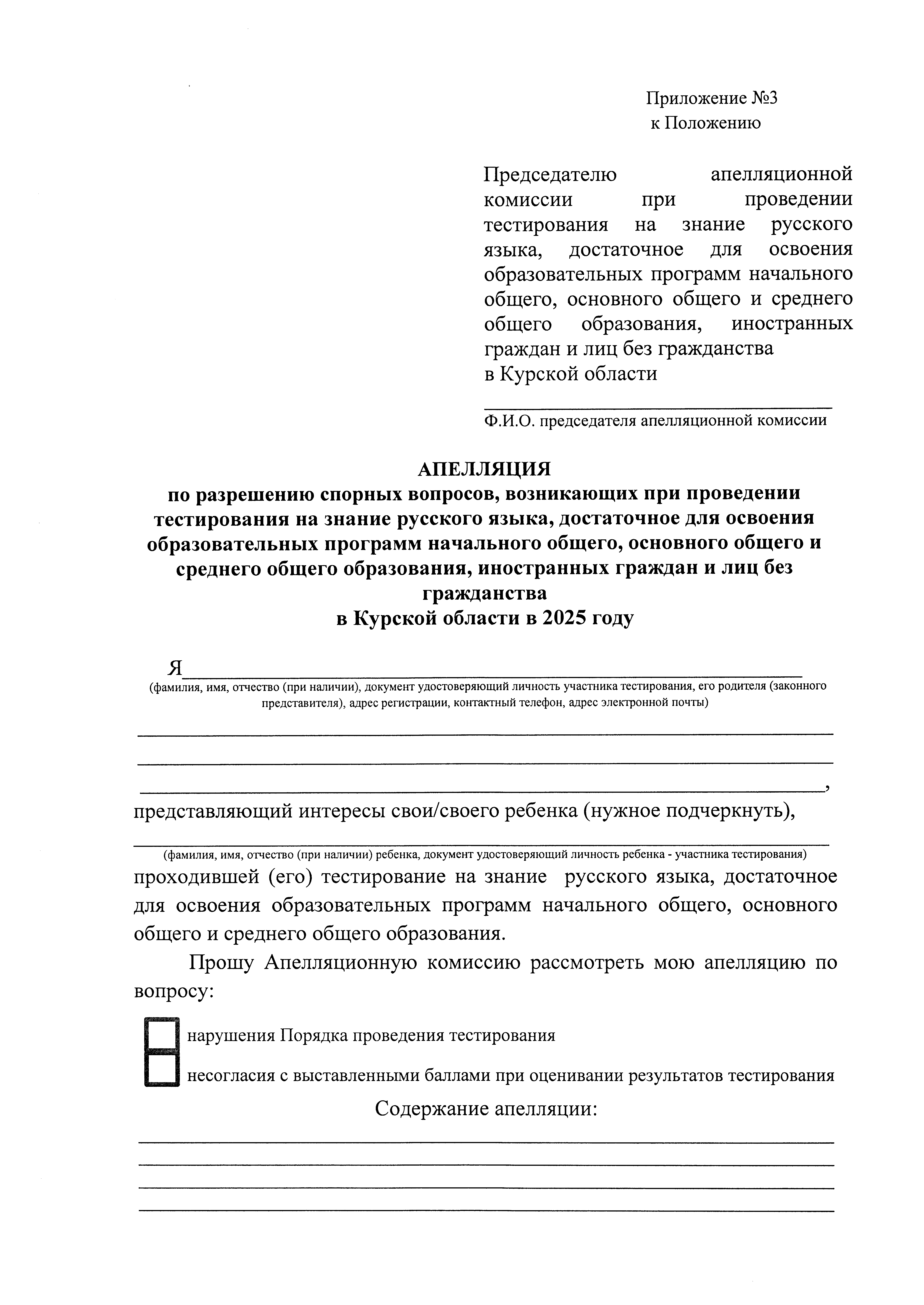 "Об утверждении Положения об организации работы апелляционной комиссии по рассмотрению апелляций в части разрешения спорных вопросов, возникающих при проведении тестирования на знание русского языка, достаточное для освоения образовательных программ начального общего, основного общего и среднего общего образования, иностранных граждан и лиц без гражданства в Курской области в 2025 году"