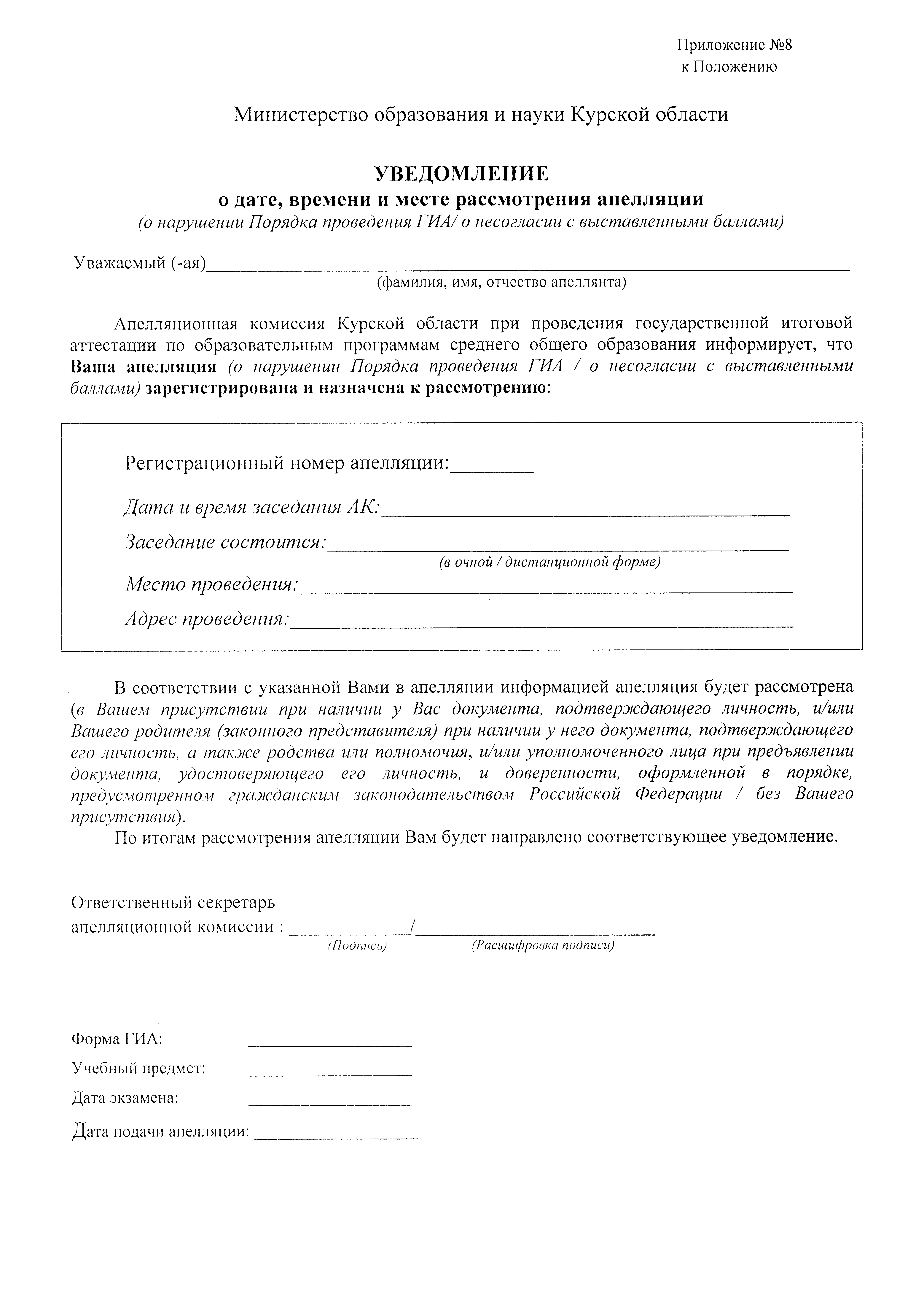 "Об утверждении Положения по организации работы апелляционной комиссии Курской области при проведении государственной итоговой аттестации по образовательным программам среднего общего образования в 2026 году"