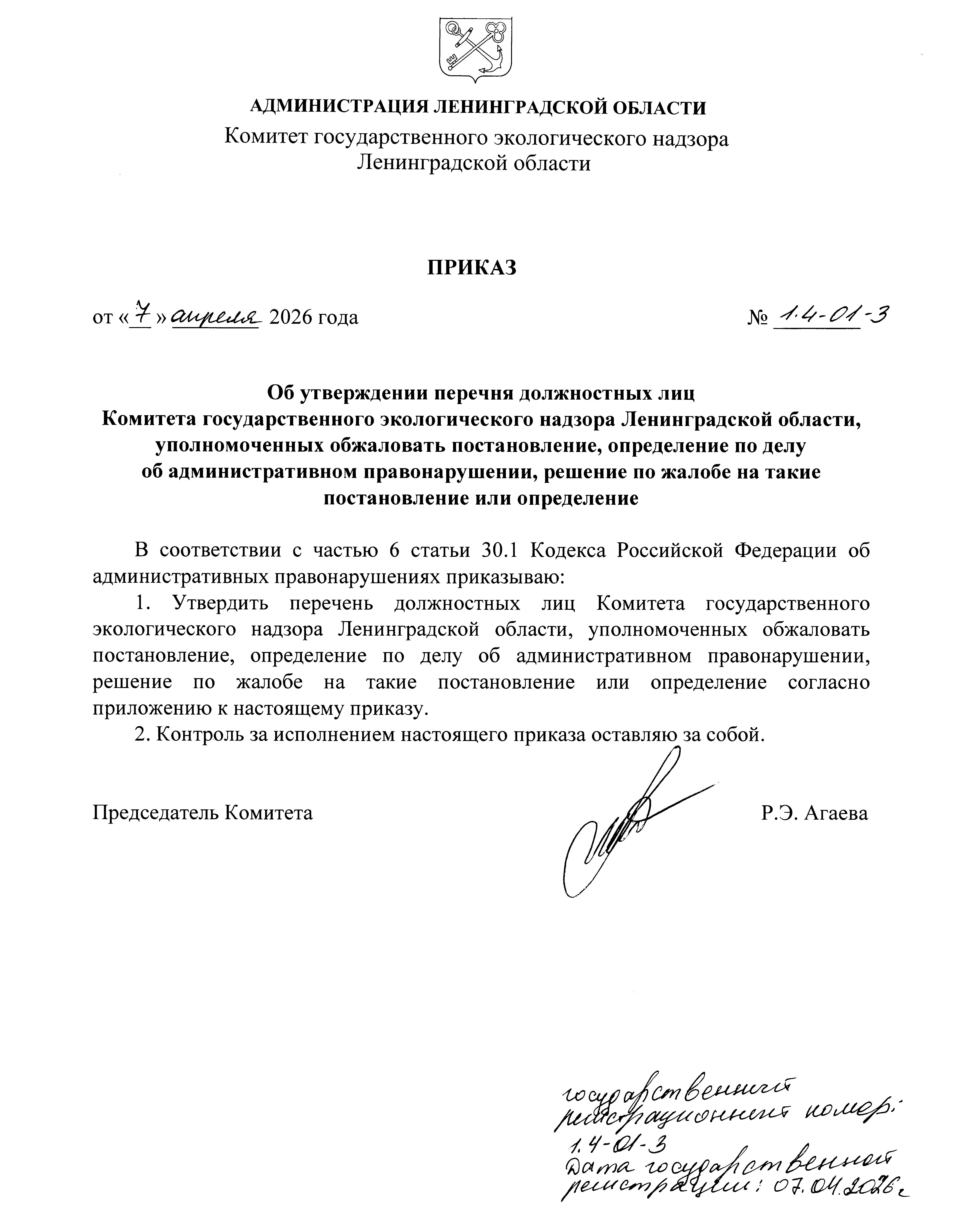 Приказ Комитета государственного экологического надзора Ленинградской области от 07.04.2026 № 1.4-01-3