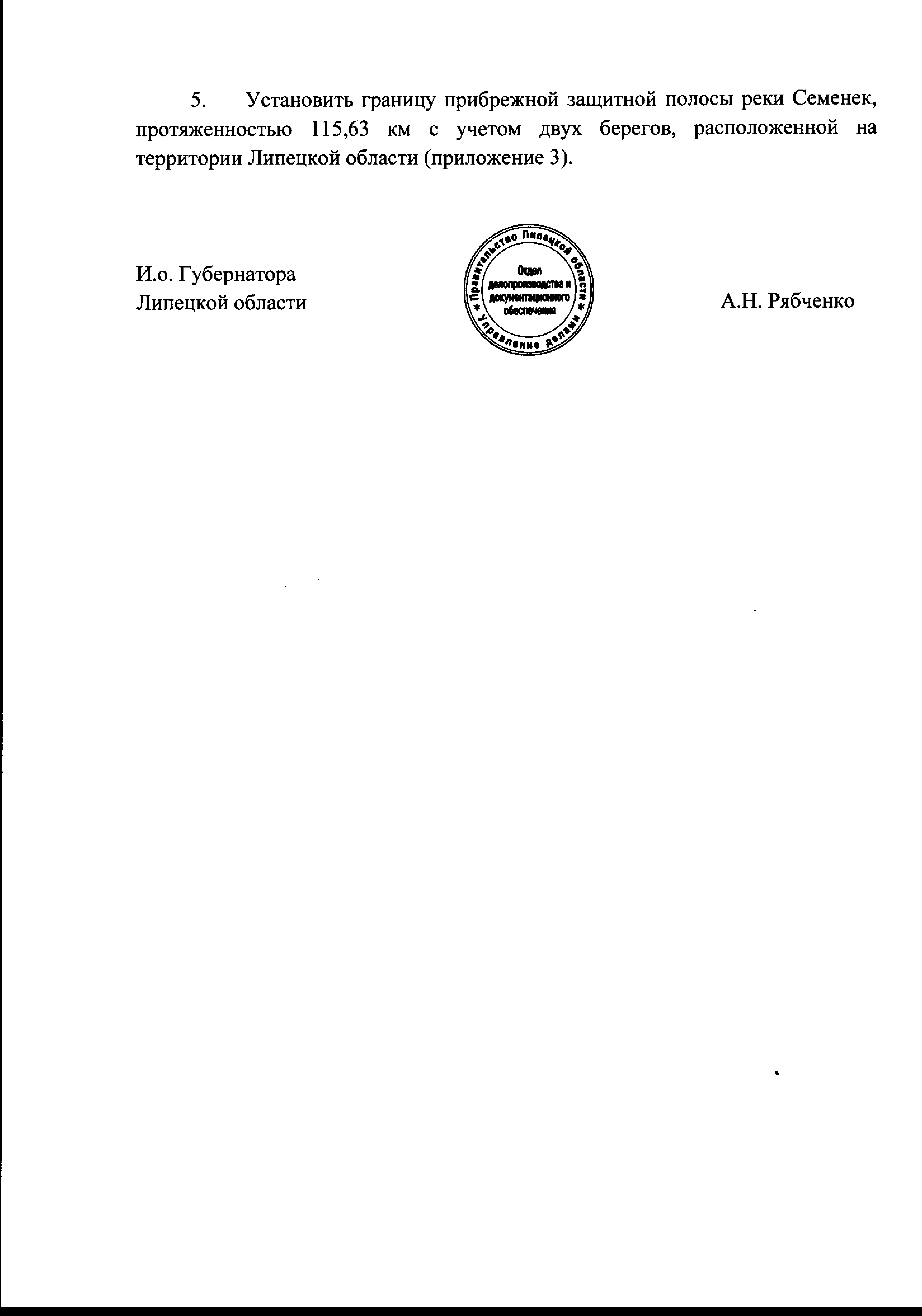 "Об установлении местоположения береговой линии (границы водного объекта), границы водоохранных зон и границы прибрежных защитных полос реки Семенек"