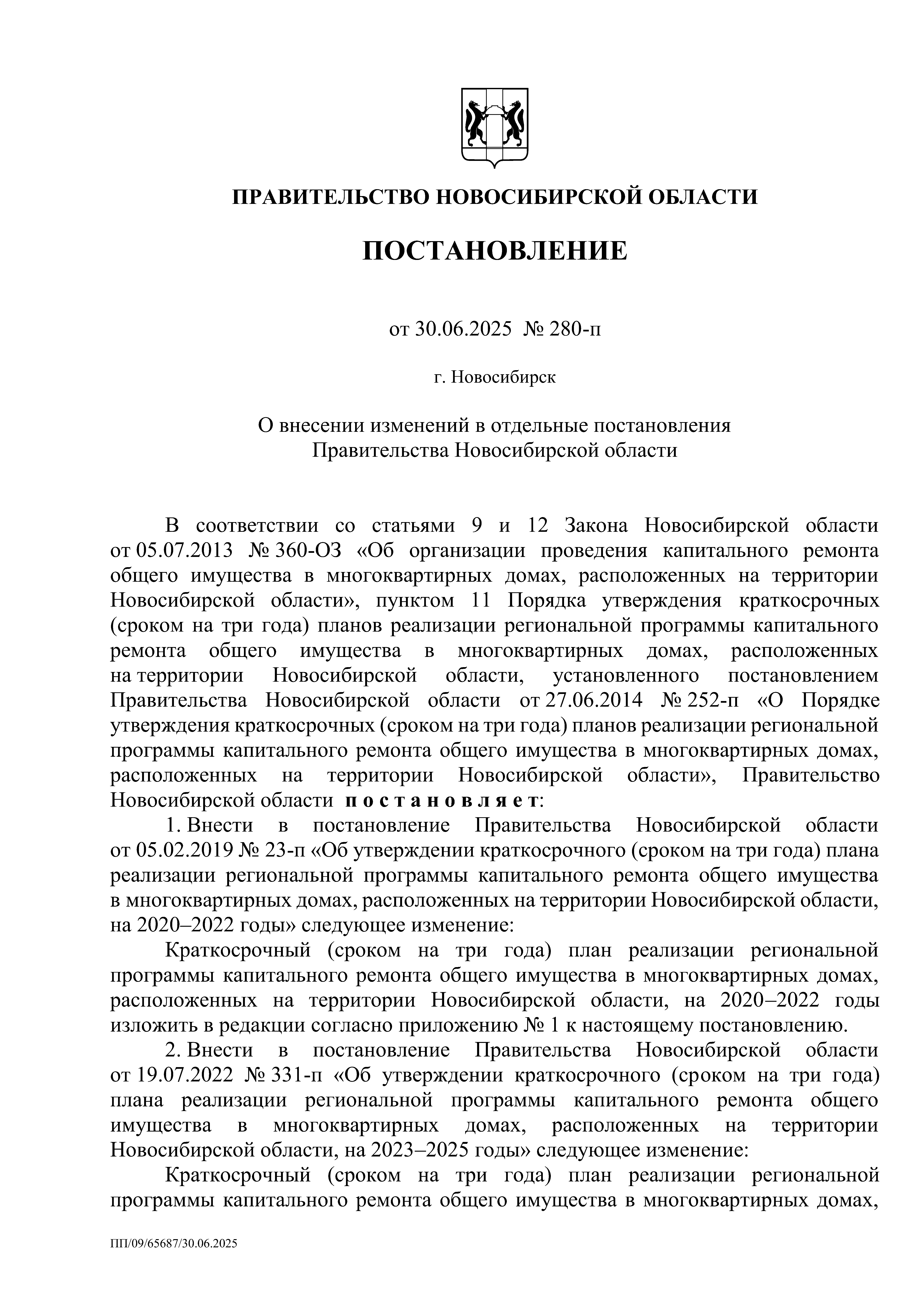 Постановление Правительства Новосибирской области от 30.06.2025 № 280-п