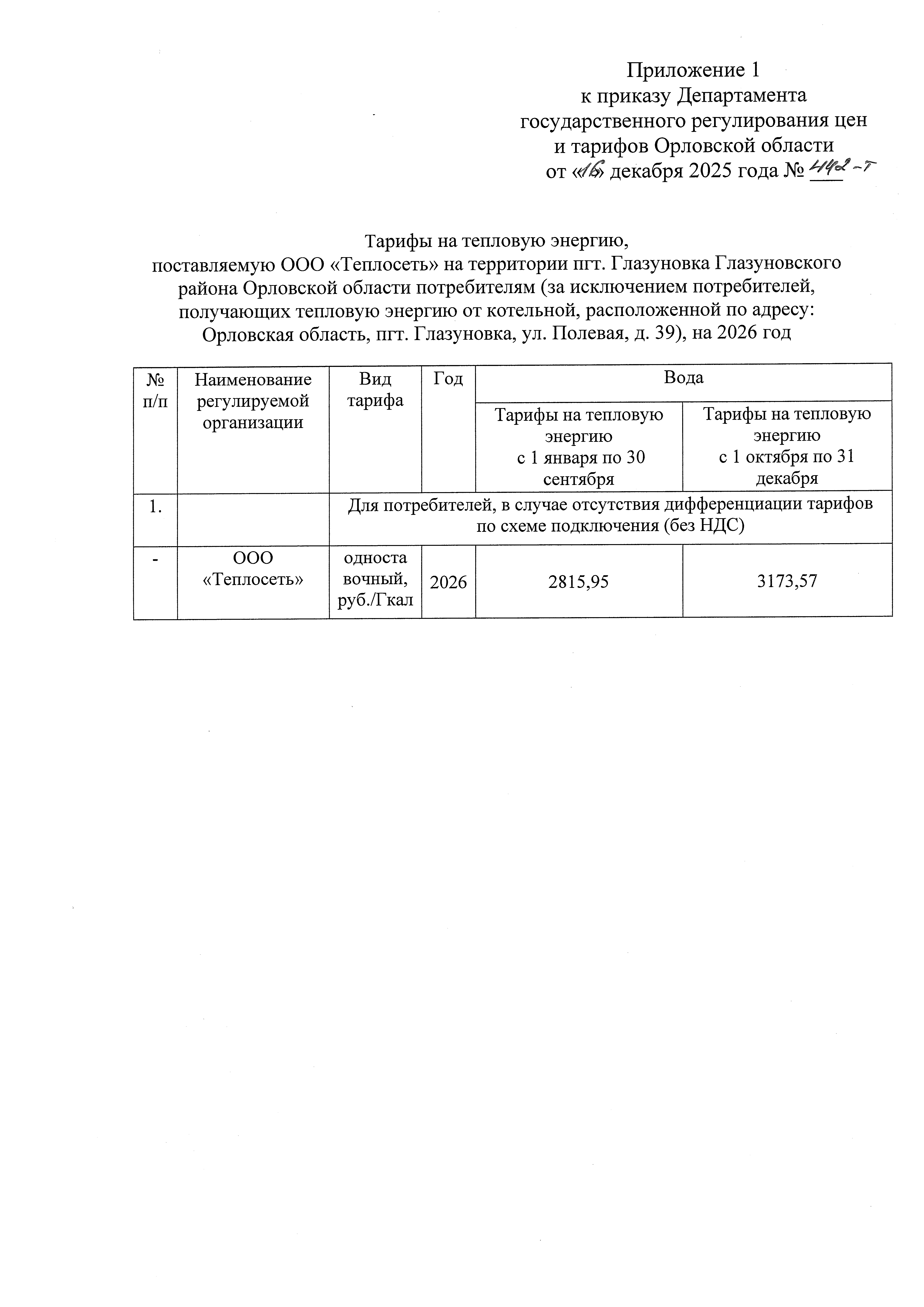 Приказ Департамента государственного регулирования цен и тарифов Орловской области от 16.12.2025 № 442-т