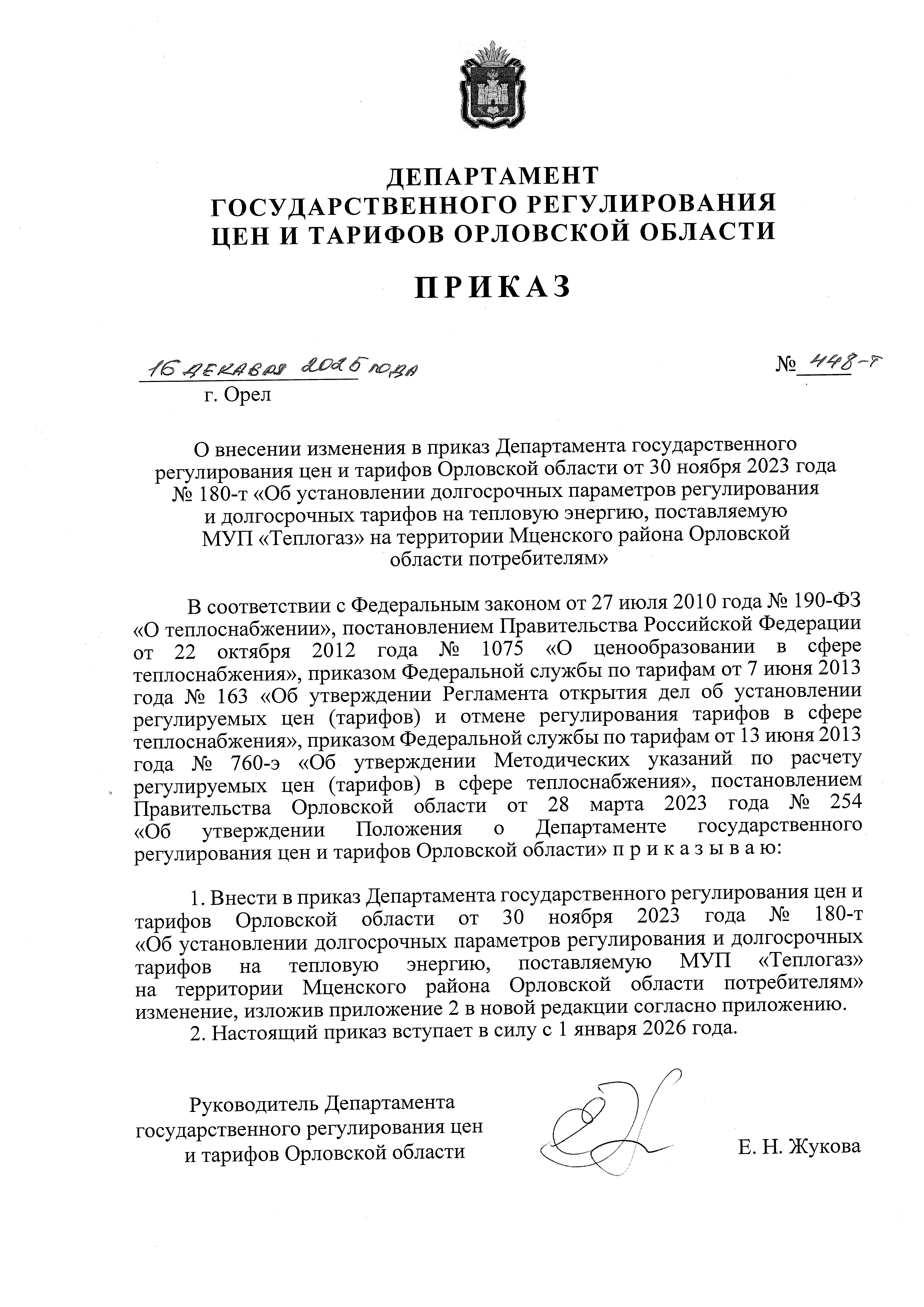 "О внесении изменения в приказ Департамента государственного регулирования цен и тарифов Орловской области от 30 ноября 2023 года № 180-т "Об установлении долгосрочных параметров регулирования и долгосрочных тарифов на тепловую энергию, поставляемую МУП "Теплогаз" на территории Мценского района Орловской области потребителям"