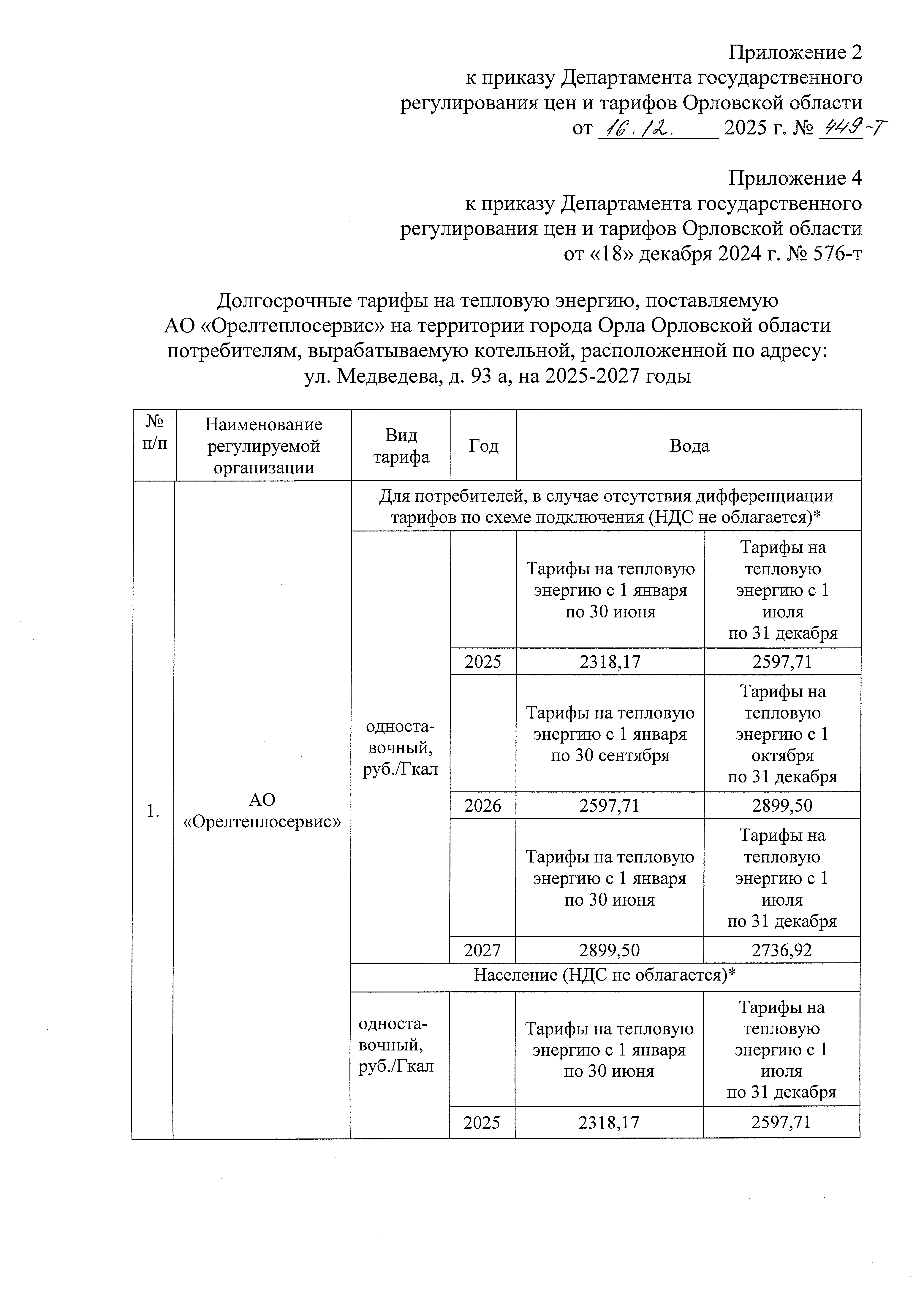 "О внесении изменений в приказ Департамента государственного регулирования цен и тарифов Орловской области от 18 декабря 2024 года № 576-т "Об установлении долгосрочных параметров регулирования и долгосрочных тарифов на тепловую энергию, поставляемую АО "Орелтеплосервис" на территории города Орла Орловской области потребителям, вырабатываемую котельными, расположенными по адресам: ул. Автогрейдерная, д. 3 г; пер. Воскресенский, д. 14 г; ул. Карачевская, д. 12 г; ул. Линейная, д. 69 а; ул. Максима Горького, д. 2, пом. 46; ул. Московская, д. 175, пом. 8; пер. Пищевой, д. 12 а; городок Рабочий, д. 22 а; ул. Планерная, стр. 31 г; ул. Медведева, д. 93 а"