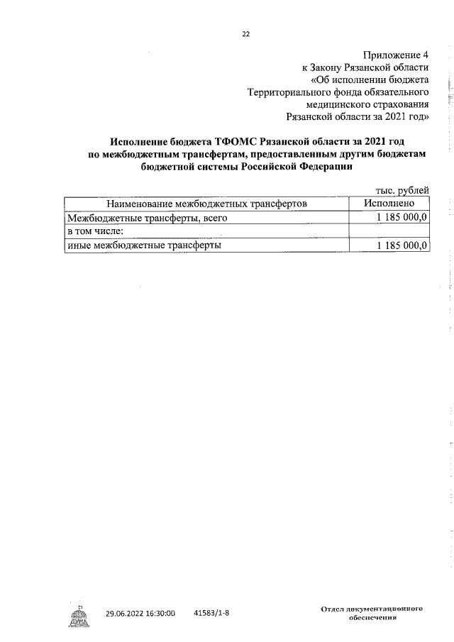 "Об исполнении бюджета Территориального фонда обязательного медицинского страхования Рязанской области за 2021 год"