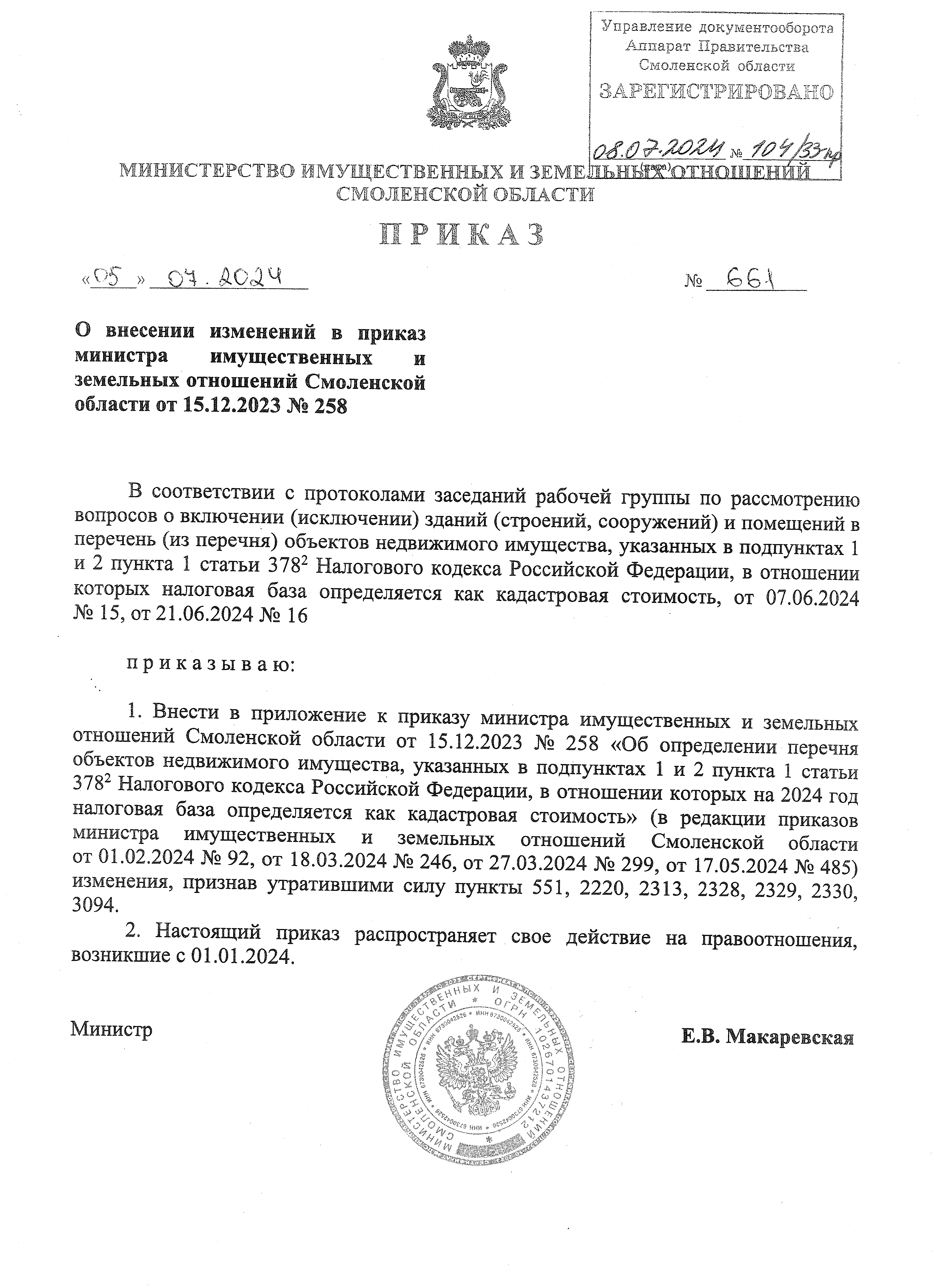 "О внесении изменений в приказ министра имущественных и земельных отношений Смоленской области от 15.12.2023 № 258"