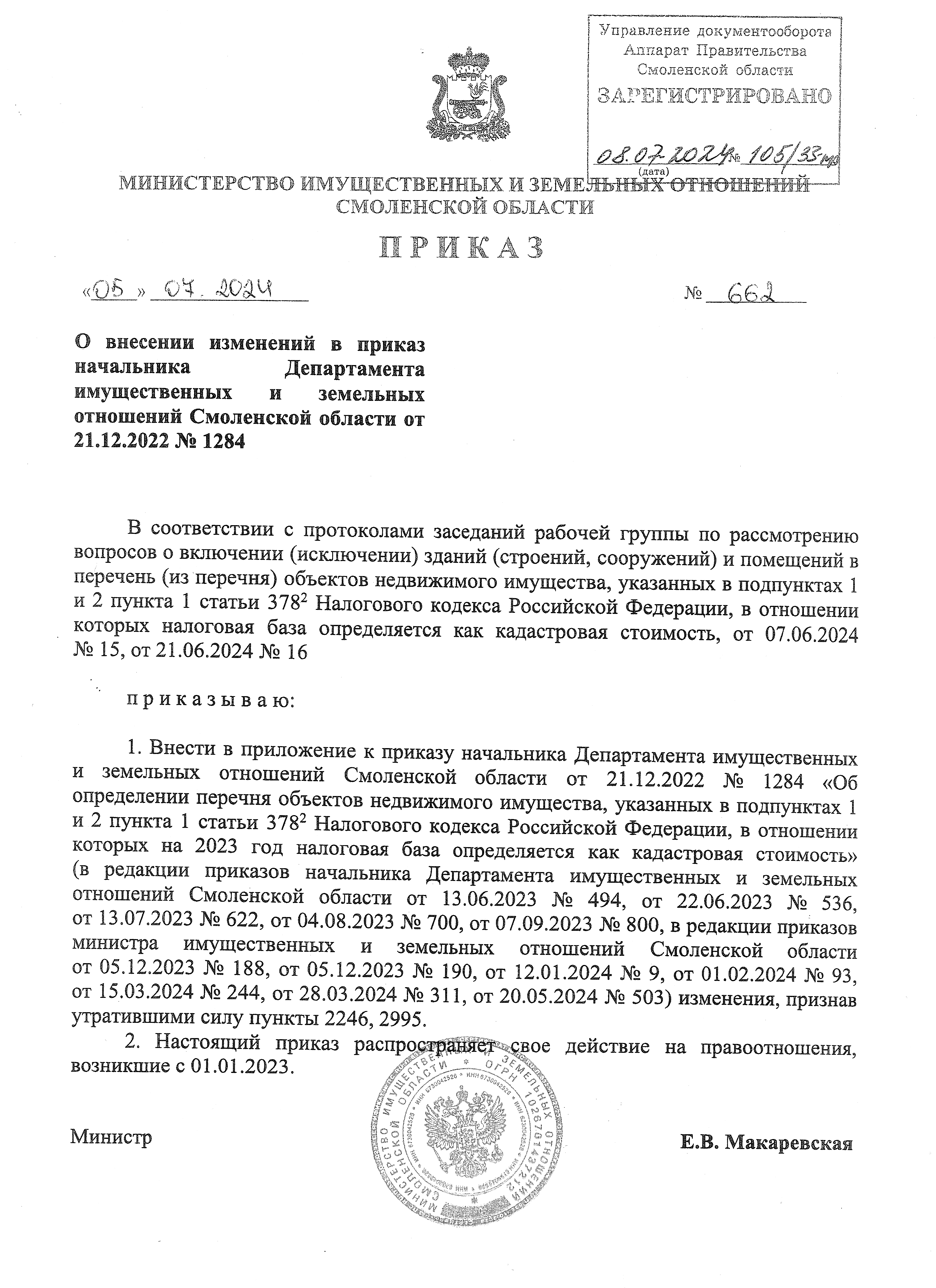 Приказ Министерства имущественных и земельных отношений Смоленской области от 05.07.2024 № 662