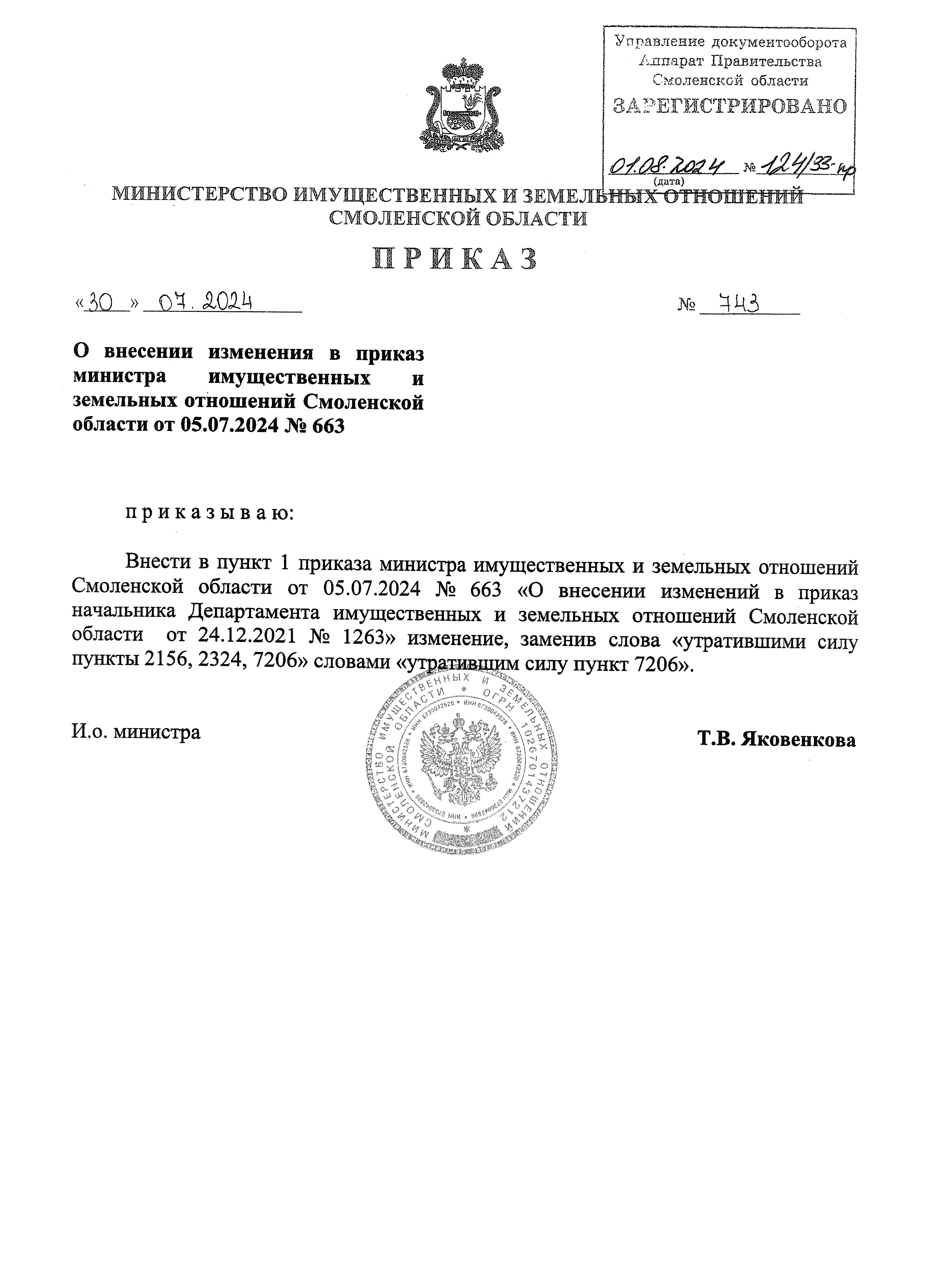"О внесении изменения в приказ министра имущественных и земельных отношений Смоленской области от 05.07.2024 № 663"