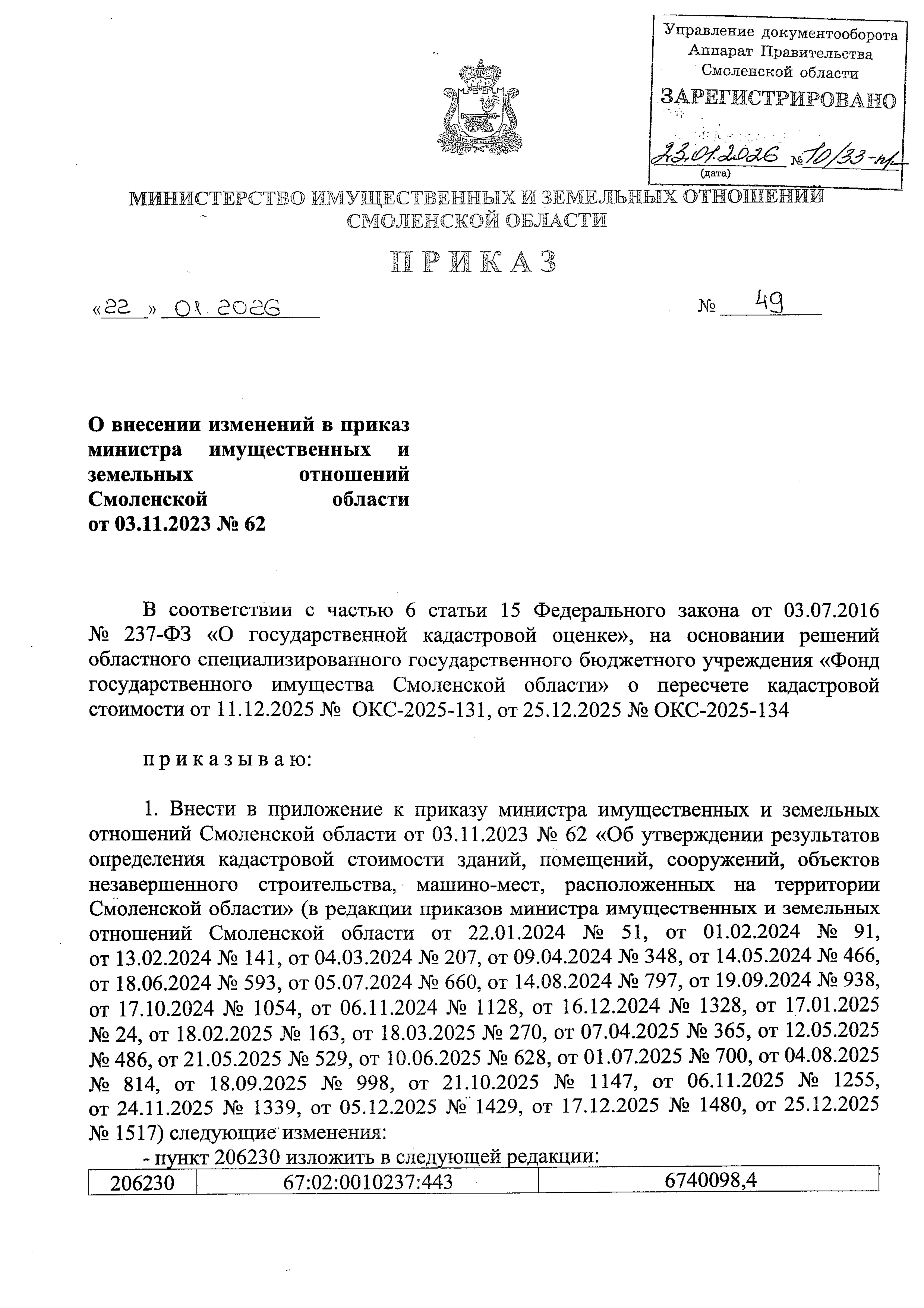 Приказ Министерства имущественных и земельных отношений Смоленской области от 22.01.2026 № 49