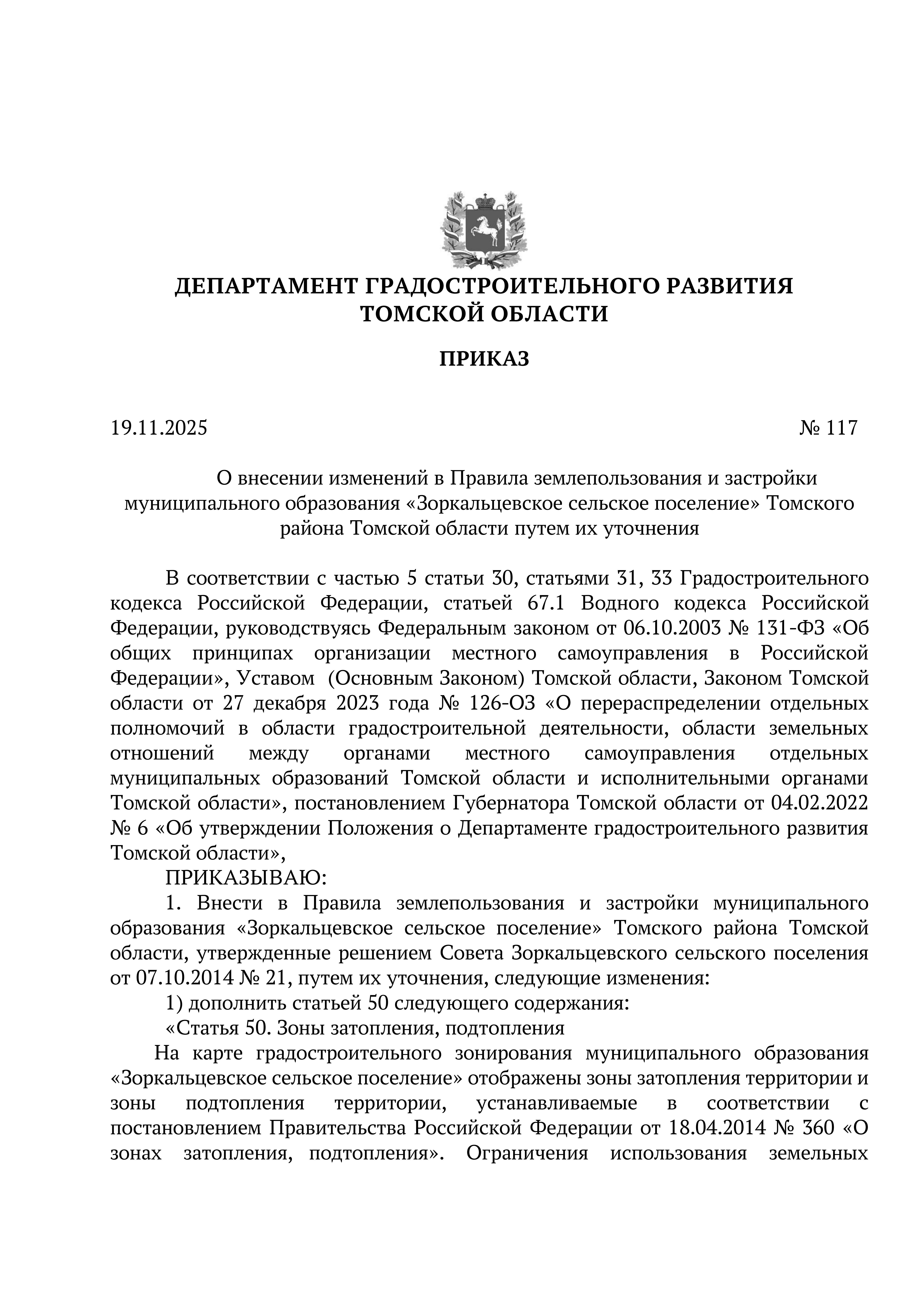 Приказ Департамента градостроительного развития Томской области от 19.11.2025 № 117