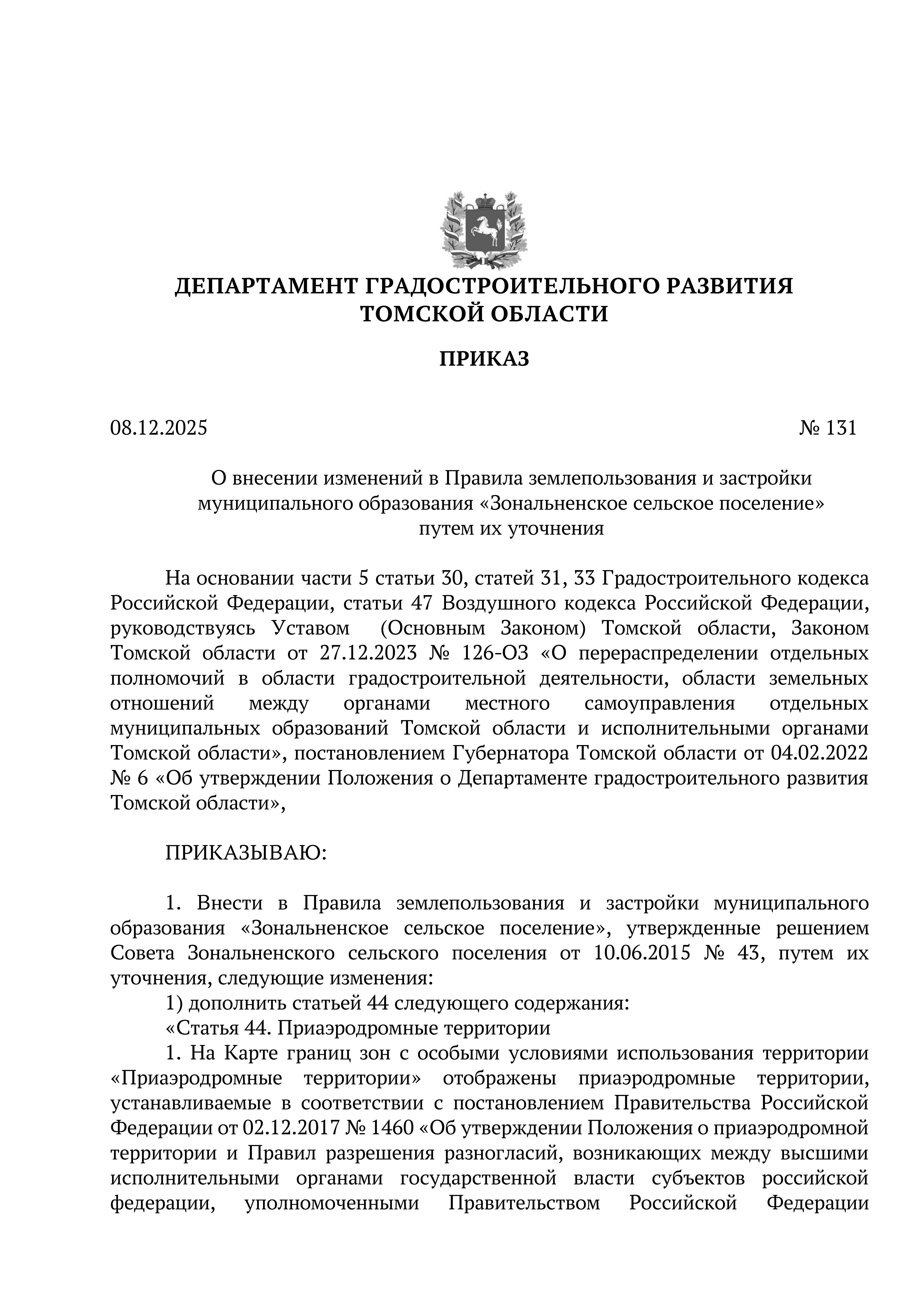 Приказ Департамента градостроительного развития Томской области от 08.12.2025 № 131