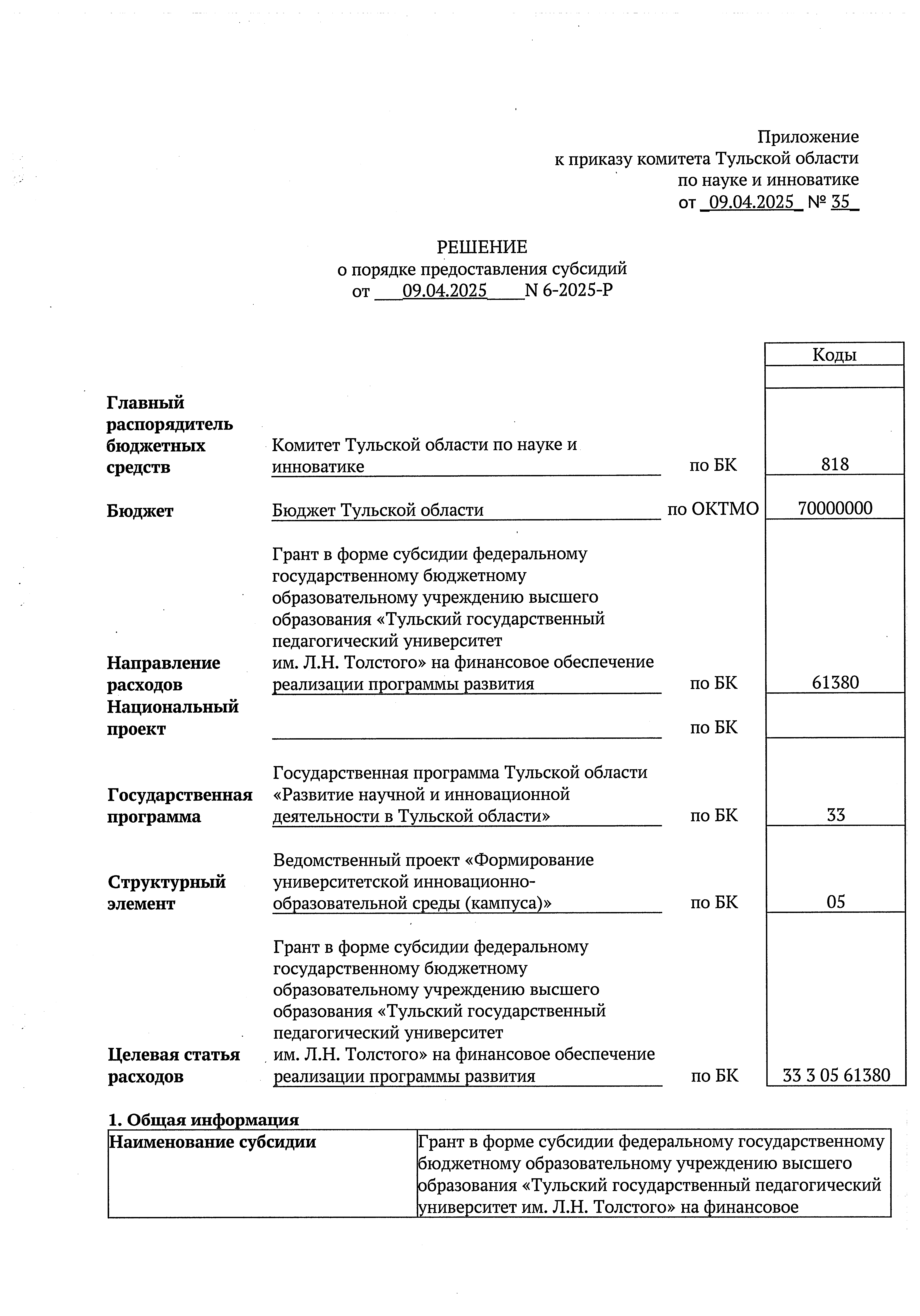 Приказ Комитета Тульской области по науке и инноватике от 09.04.2025 № 35