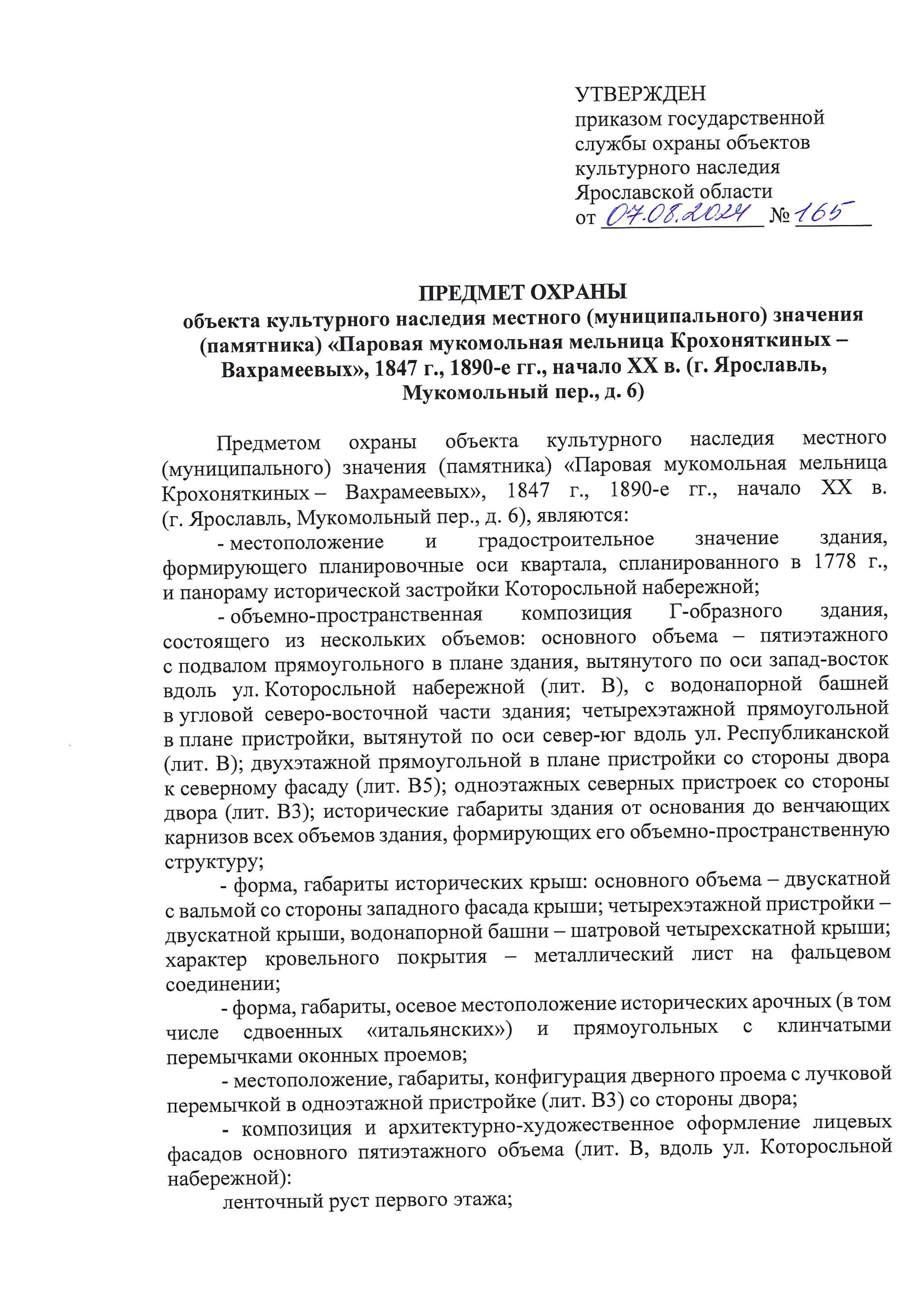 Приказ государственной службы охраны объектов культурного наследия Ярославской области от 07.08.2024 № 165