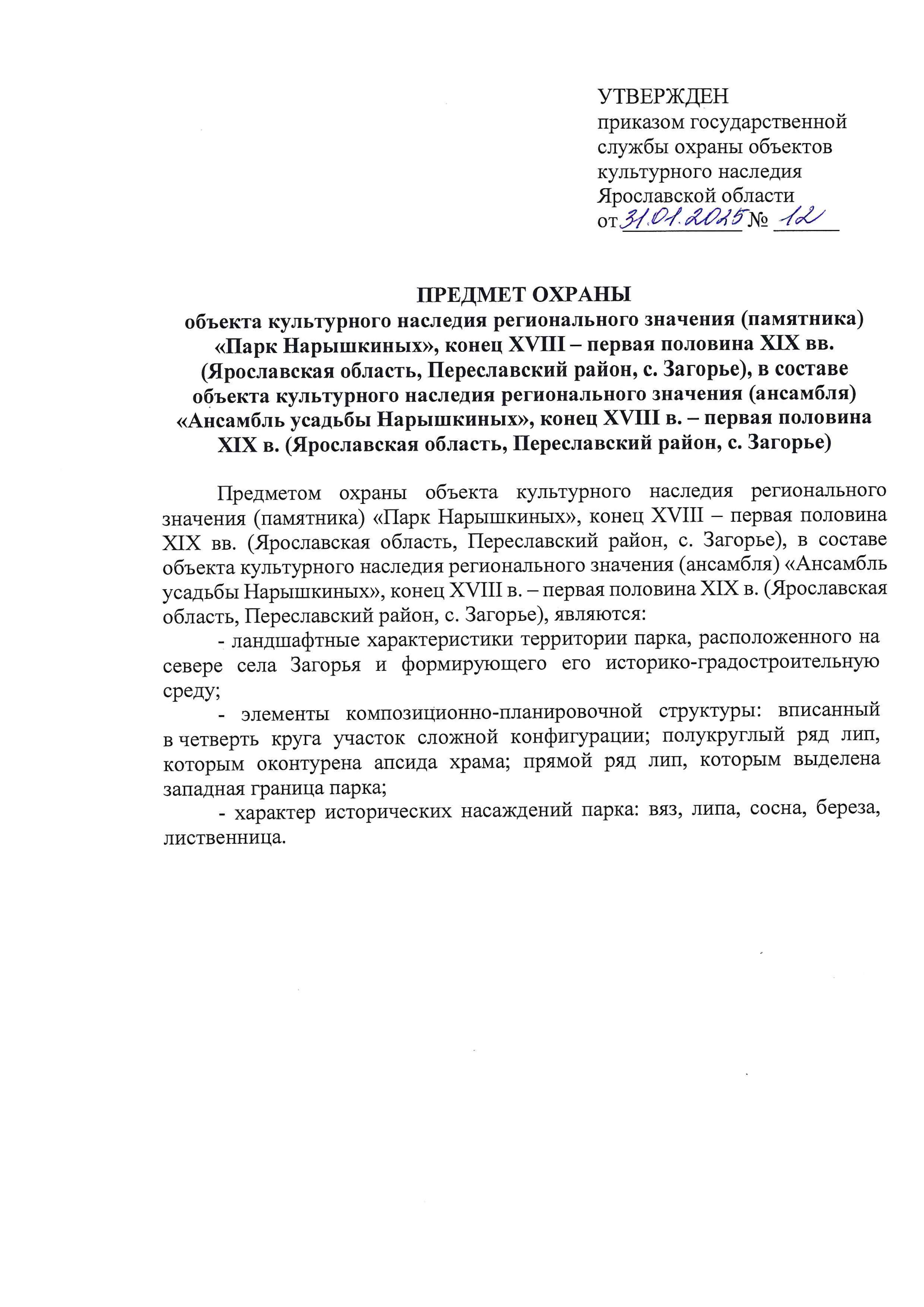 Приказ государственной службы охраны объектов культурного наследия Ярославской области от 31.01.2025 № 12