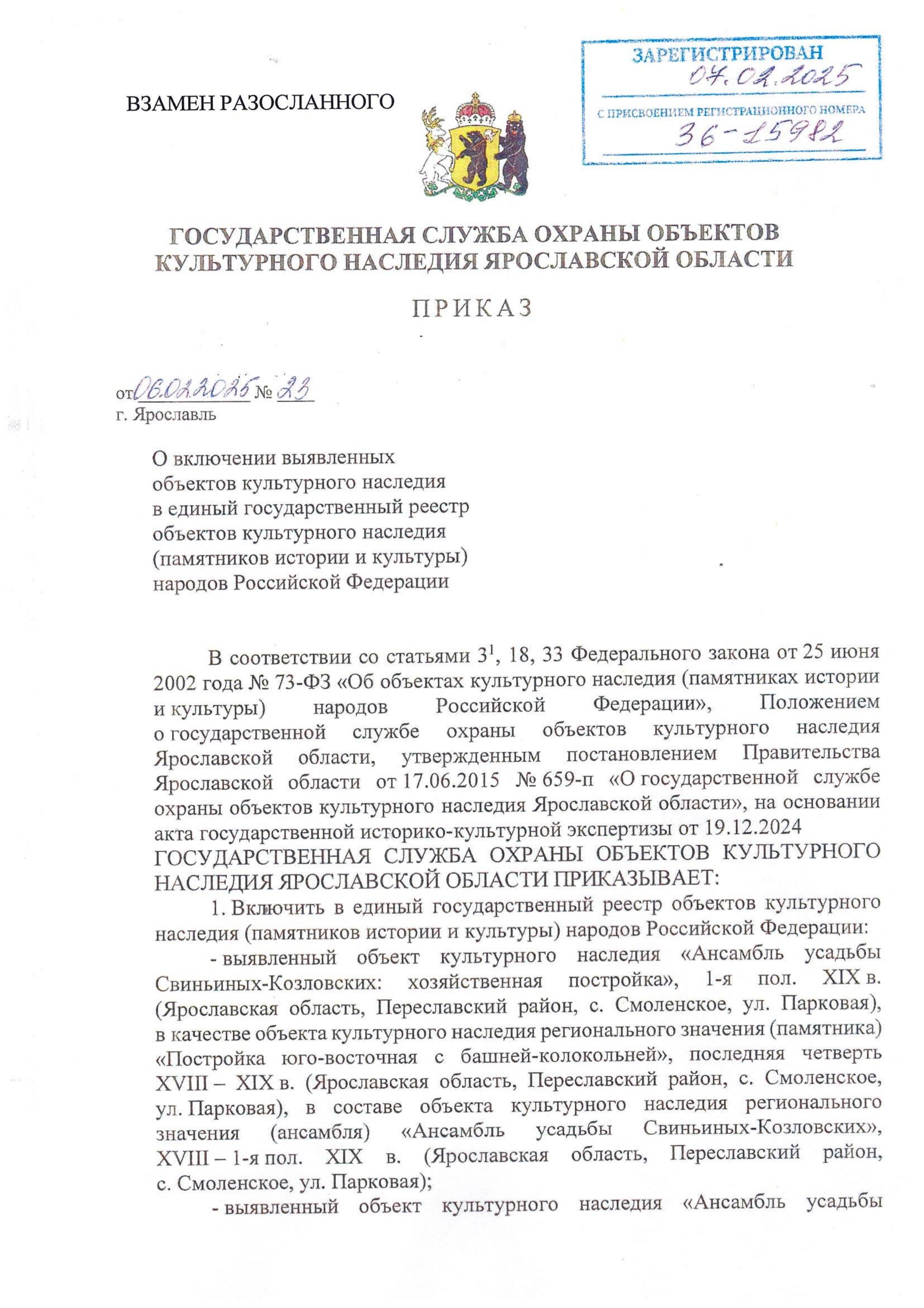 Приказ государственной службы охраны объектов культурного наследия Ярославской области от 06.02.2025 № 23