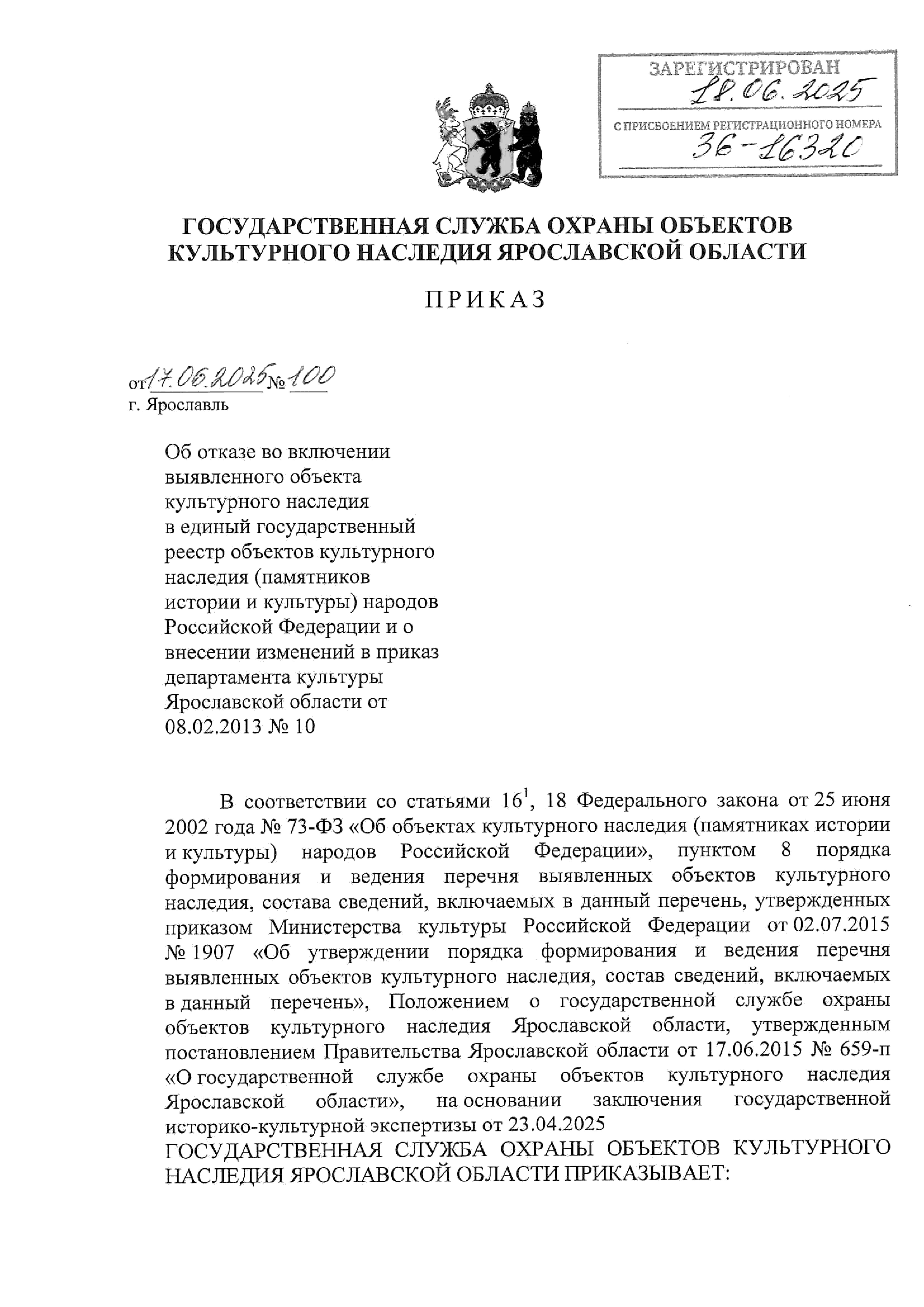 Приказ государственной службы охраны объектов культурного наследия Ярославской области от 17.06.2025 № 100