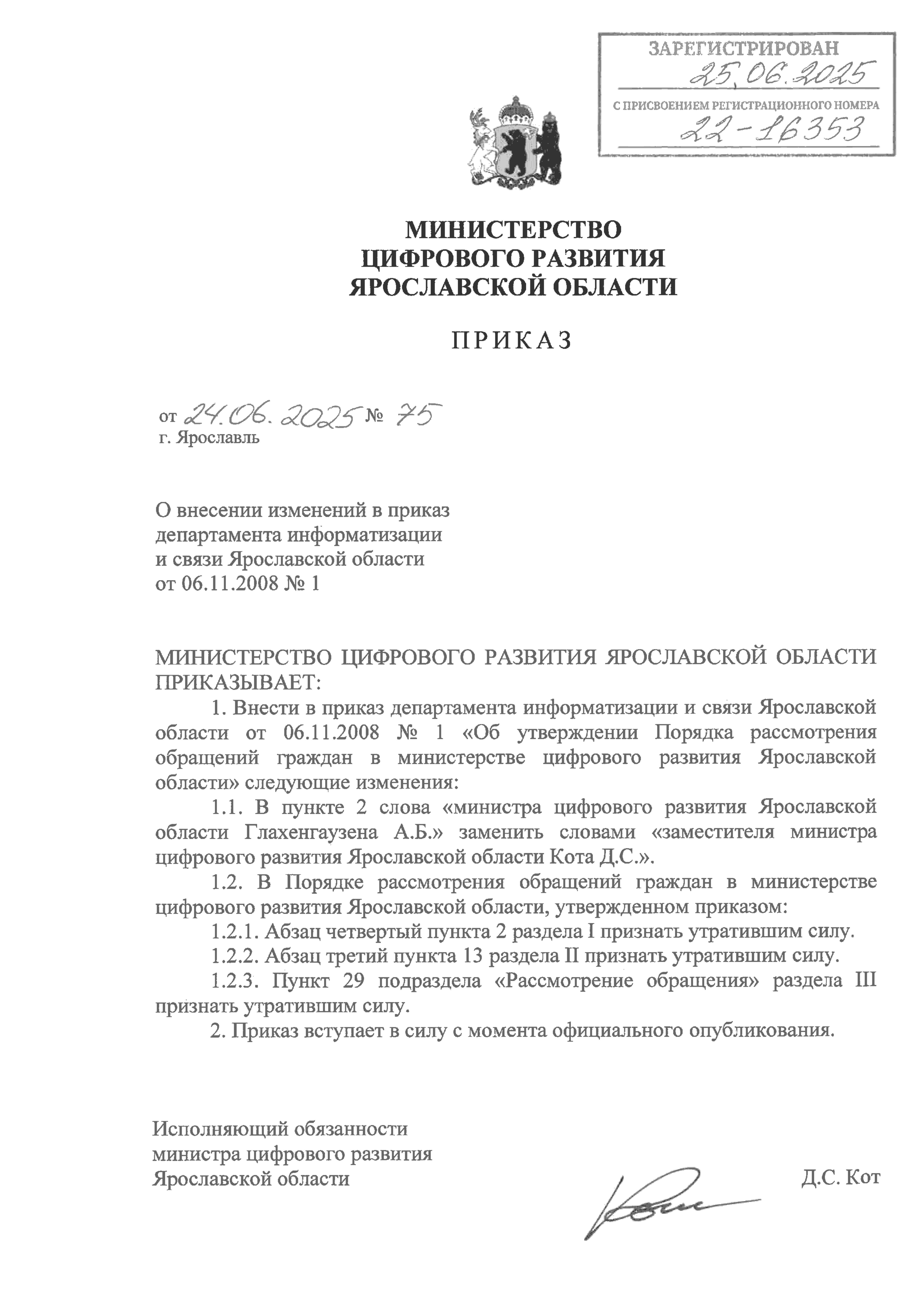 Приказ министерства цифрового развития Ярославской области от 24.06.2025 № 75