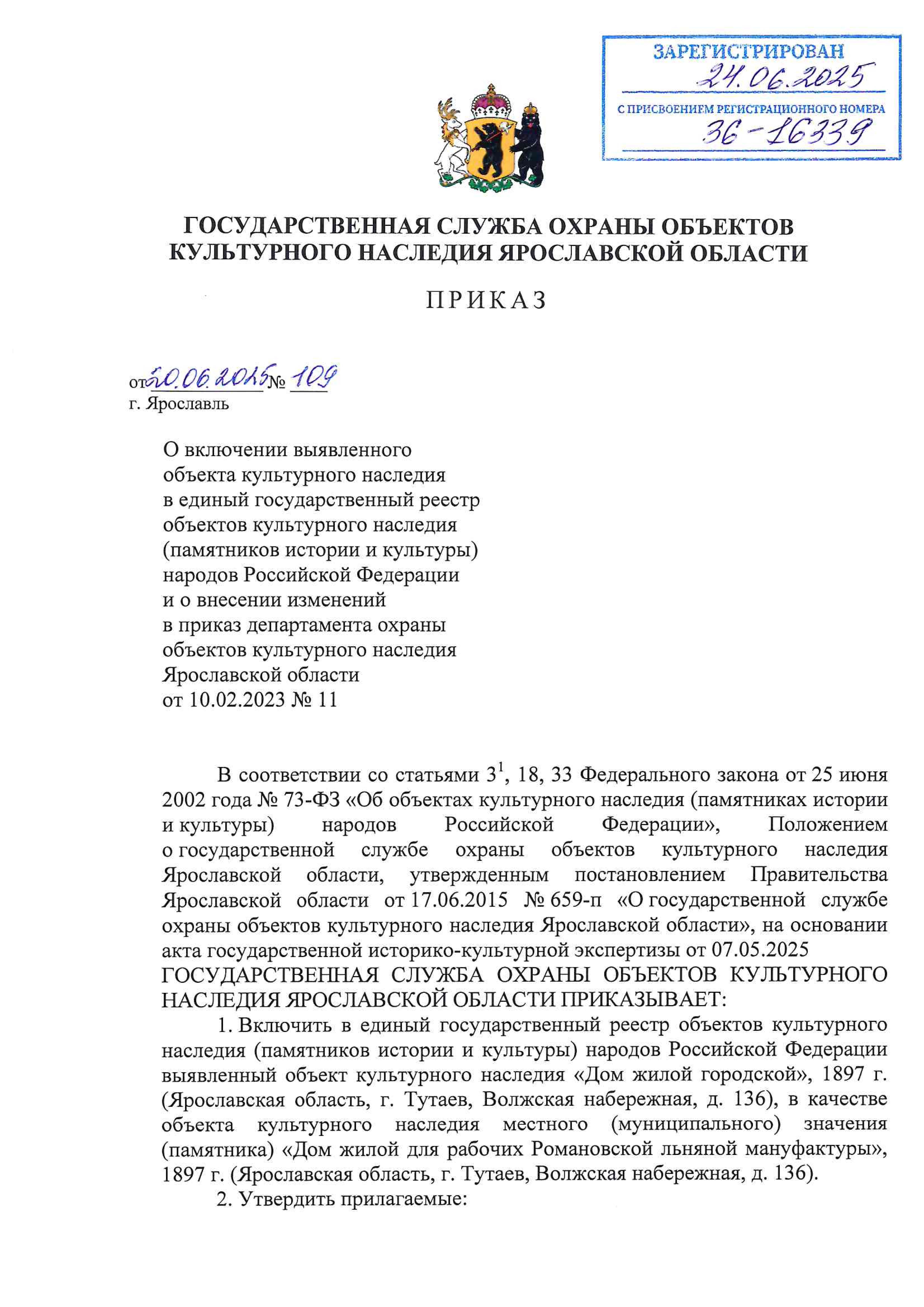 Приказ государственной службы охраны объектов культурного наследия Ярославской области от 20.06.2025 № 109
