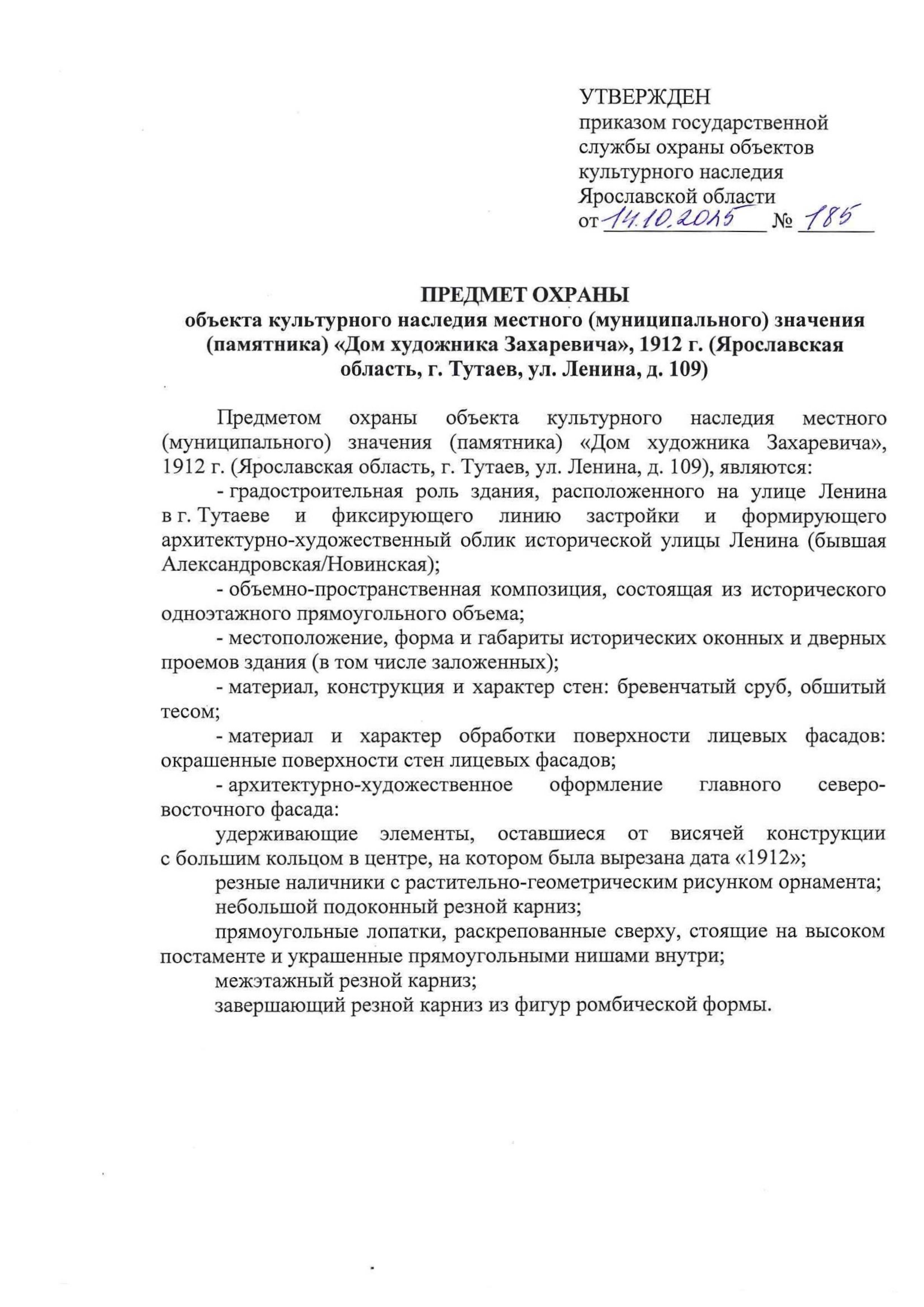 Приказ государственной службы охраны объектов культурного наследия Ярославской области от 14.10.2025 № 185