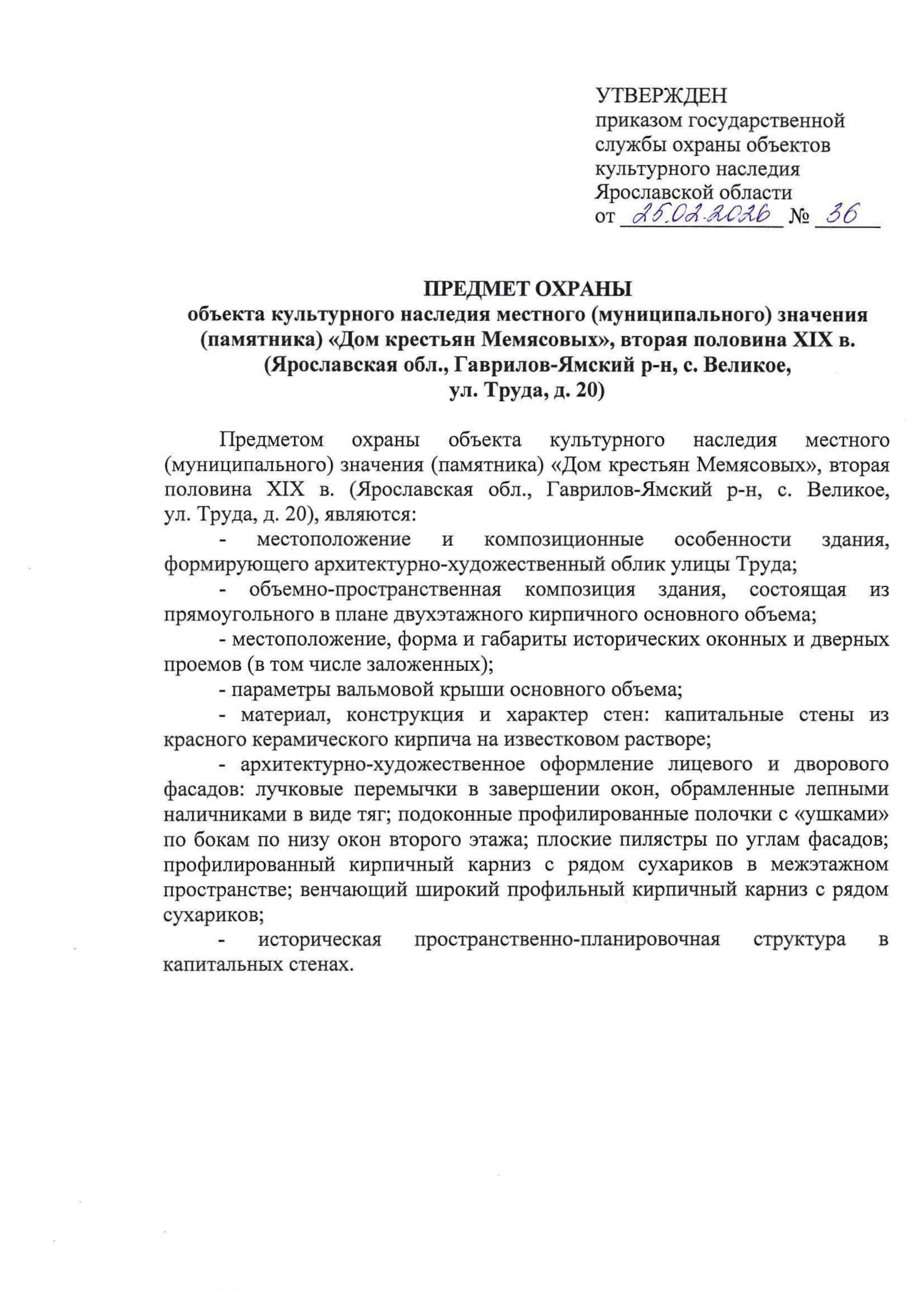 Приказ государственной службы охраны объектов культурного наследия Ярославской области от 25.02.2026 № 36