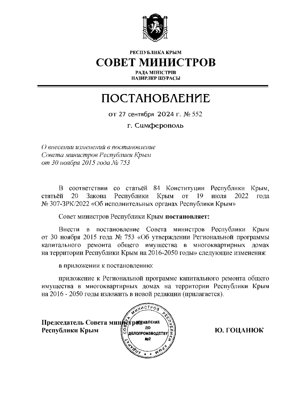 Постановление Совета министров Республики Крым от 27.09.2024 № 552